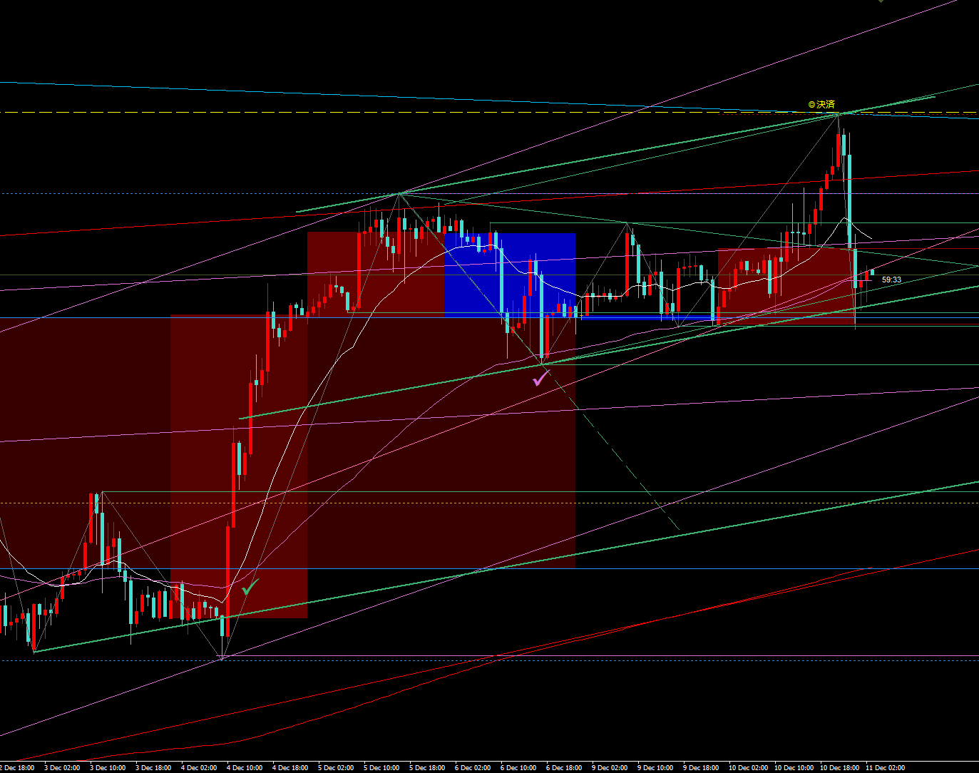 2枚目の画像は、4時間足のチャートに日足と週足を同時表示させたものです。